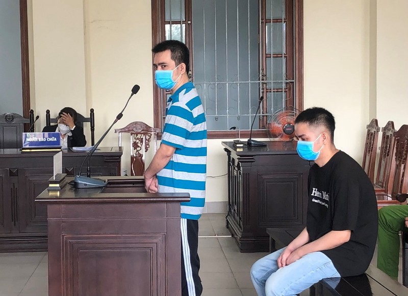 Hai bị cáo Trung (áo sọc xanh) và Hùng tại tòa ngày 25-1. Ảnh: NHẪN NAM