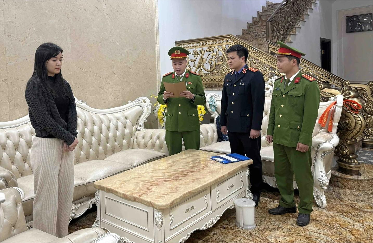 Cơ quan công an tống đạt quyết định khởi tố bị can, bắt tạm giam đối với Nguyễn Thu Nga – Ảnh: CTV