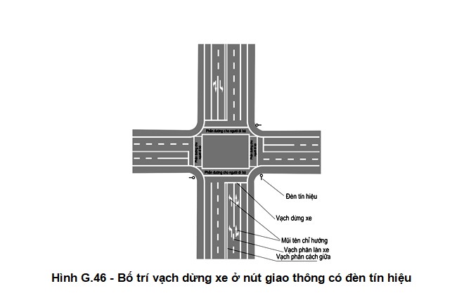 Tại các ngã tư có đặt đèn tín hiệu giao thông hoặc có người điều khiển giao thông sẽ có vạch dừng xe (vạch 7.1) theo QCVN 41:2019/BGTVT ban hành kèm theo Thông tư số 54/2019/TT-BGTVT.