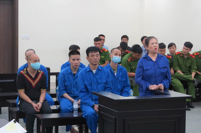 Bị cáo Nguyễn Thị Chiến (ngoài cùng, bên phải) và các bị cáo tại phiên tòa. Ảnh: CTV