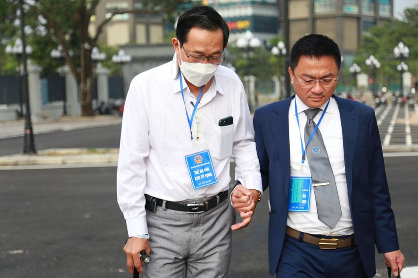 Cựu thứ trưởng Cao Minh Quang được luật sư dìu vào phòng xử hôm 21-11. Ảnh: UYÊN TRANG