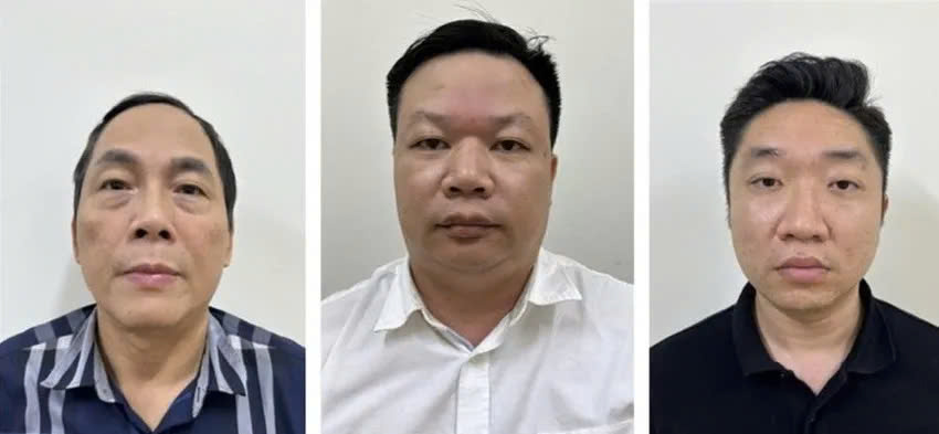 Các bị can (từ trái qua phải) Hoàng Quốc Hùng, Lương Nhân Hoà, Nguyễn Đình Cảnh. Ảnh: BCA